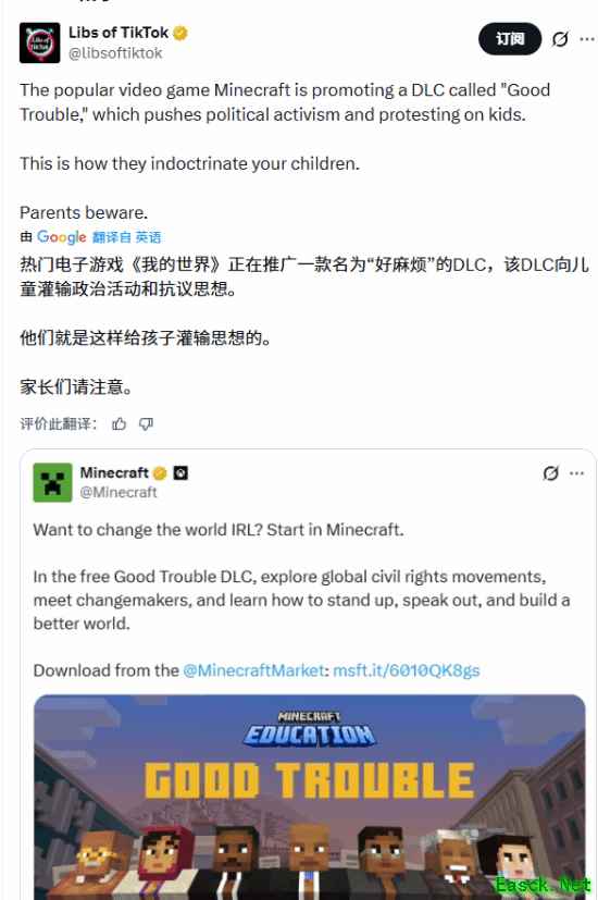 公告发布后仅数小时,评论区便沦为舆论战场,争议迅速升温。大量玩家及家长纷纷发声批评,认为该 DLC 本质是 “政治宣传”,质疑 Mojang 借游戏向儿童灌输民权激进主义思想。有用户直言 “把这种政治宣传赶出 Minecraft”,还有家长表示 “游戏面向儿童,不该让他们被政治内容淹没,我不想我的孩子接触这些东西”。知名游戏主播 Syndicate 转发该公告并质疑 “这到底是什么鬼”,单条转发就带来 480 万浏览量,进一步放大了争议;账号 Libs of TikTok 更是发帖指责,称 Minecraft“向儿童推行政治激进主义和抗议活动,这是在灌输孩子”,该帖子浏览量超 25.4 万,引发更多人跟风质疑。