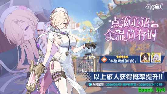 活动期间,旅人招募卡池「点滴心语余温尚存时」于2月3日限时开启,全新5星旅人【科洛妮丝(新春)】获得限时招募概率提升。受到璟麟的邀请,换上新装的科洛妮丝正在苍梧享受假期,体验别样的生活气息。在战斗中,科洛妮丝(新春)是均衡定位的地属性角色,以各式药剂能为战斗提供多样可能性,展现迷人风姿。