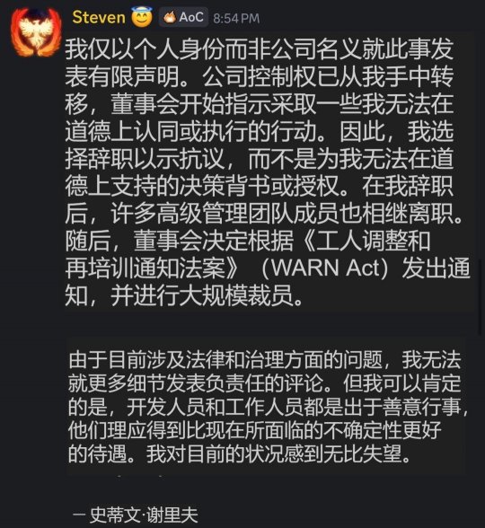 危机的开端是多名IntrepidStudios员工在LinkedIn上发布求职贴。其中,前通讯总监玛格丽特·克罗恩证实:“所有人都被解雇了。这太糟糕了。”随后,公司创始人兼《创世灰烬》创意总监史蒂文·谢里夫在游戏社区上发布声明,称公司的控制权已从他手中转移,董事会采取了其“在道德上无法同意或执行”的行动,因此他选择辞职抗议。其离职引发了核心领导团队的集体出走,董事会随后决定依据《WARN法案》启动大规模裁员。