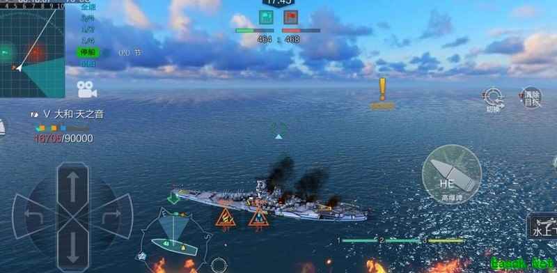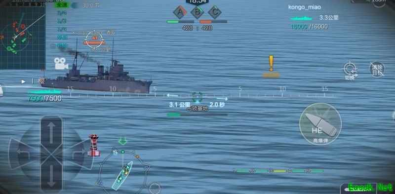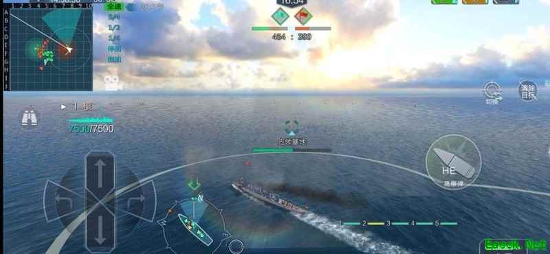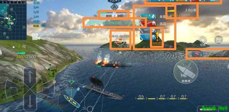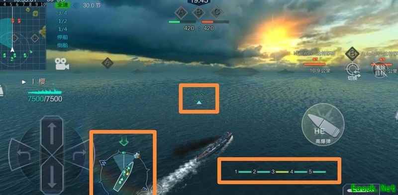 接下来继续讲解。图中已标注的部分不再赘述。正上方功能在介绍游戏模式时已提及,舰船操控、瞄准、主炮射击及鱼雷发射在新手教程中均有涉及,此处仅补充瞄准相关内容:操作任意武器时,点击瞄准将切换至主炮模式,此时界面显示所示。