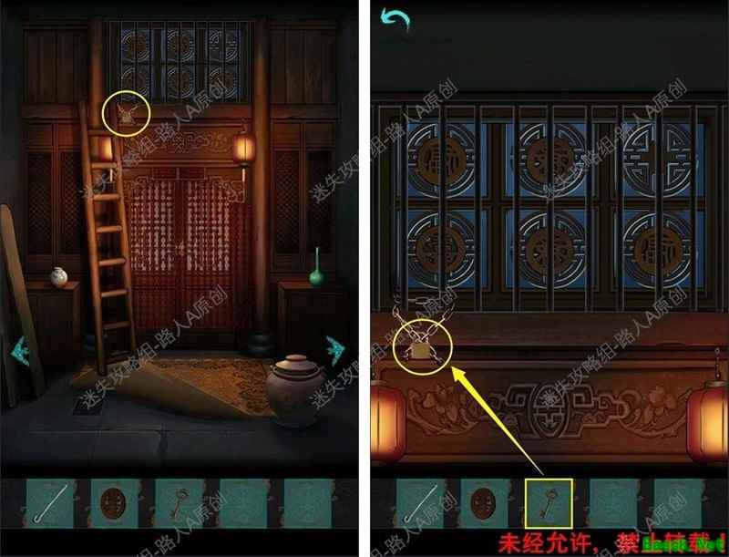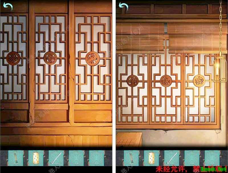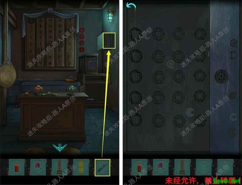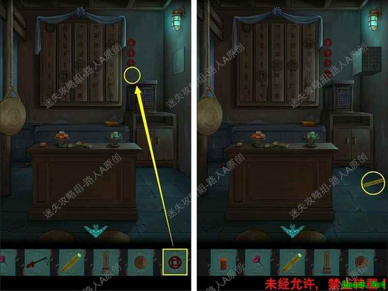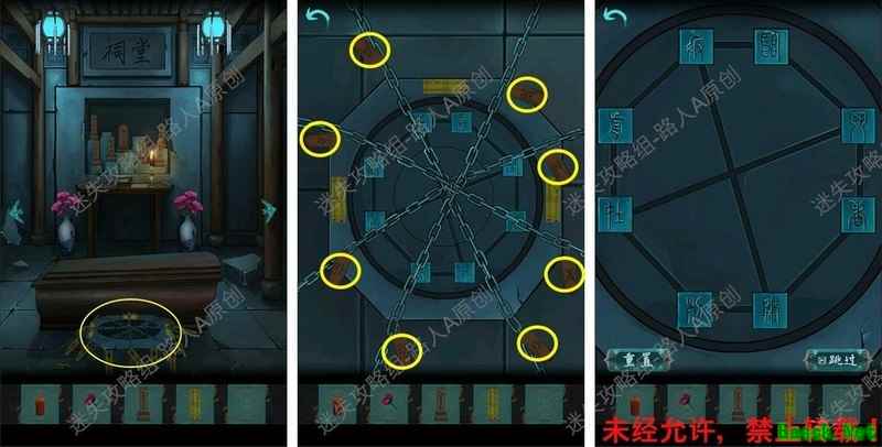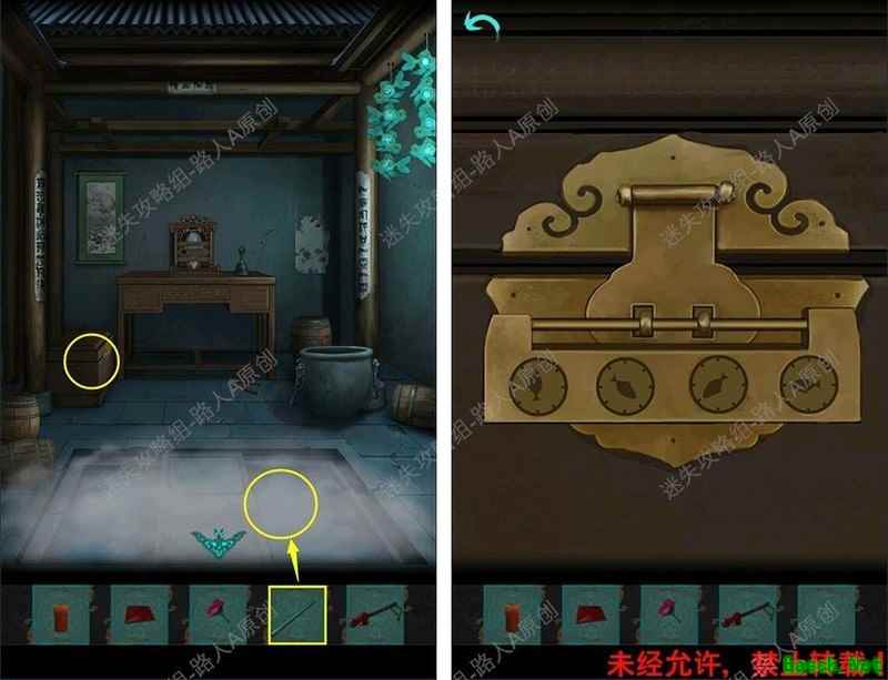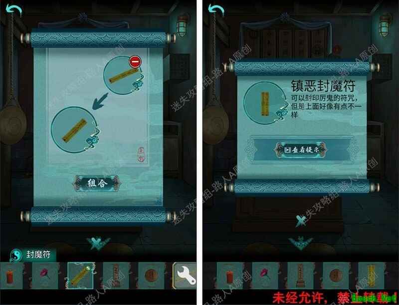 用铁棍驱赶水池中的鱼,结合水池图案与吊灯的对应关系,按鱼的数量确定顺序,解开箱子机关,获得金属圆扣和封魔符。
