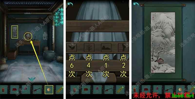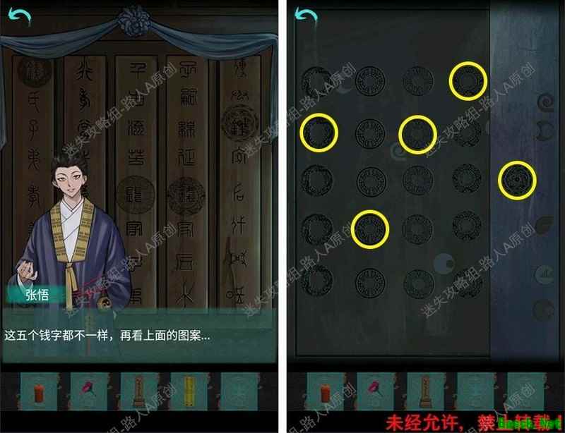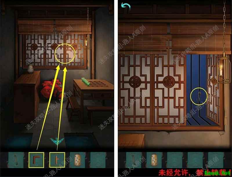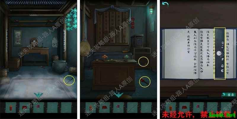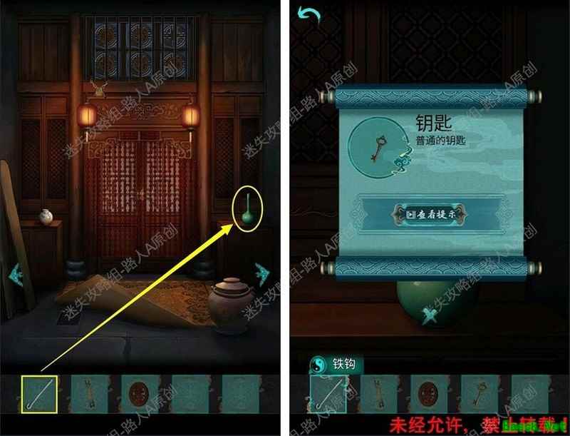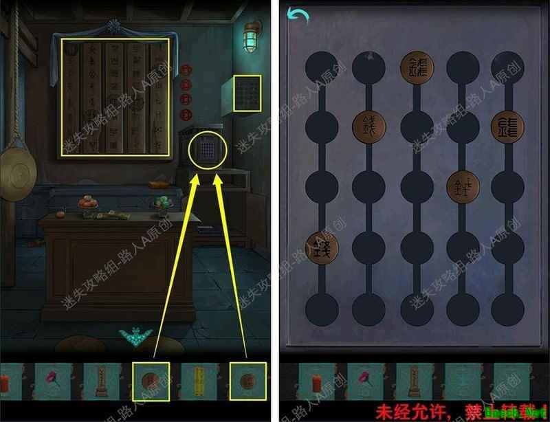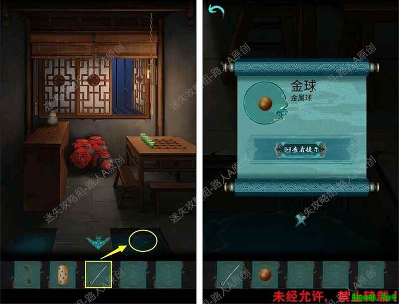 用铁棍驱赶水池中的鱼,结合水池图案与吊灯的对应关系,按鱼的数量确定顺序,解开箱子机关,获得金属圆扣和封魔符。