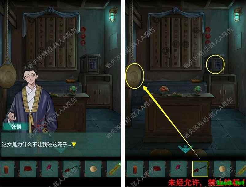 点击笼子触发女鬼,使用锣锤敲锣即可将其驱散。