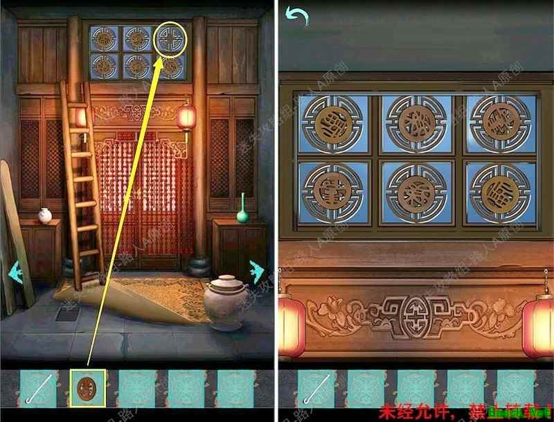 将雕花圆盘放入窗框缺失位置,参照左右两间房的窗格图案进行调整后离开。上方图案对应左侧房间,下方对应右侧房间。当前存在一个显示异常:机关底部中央图样与窗户提示相反,建议先完成其余五个部分,最后单独调整此位置即可通过。