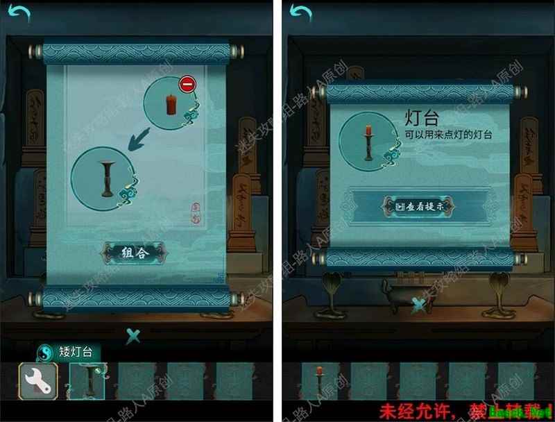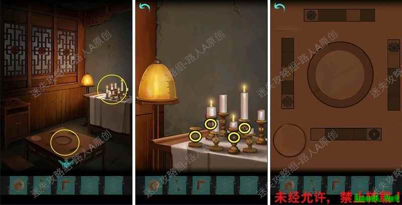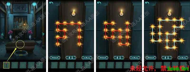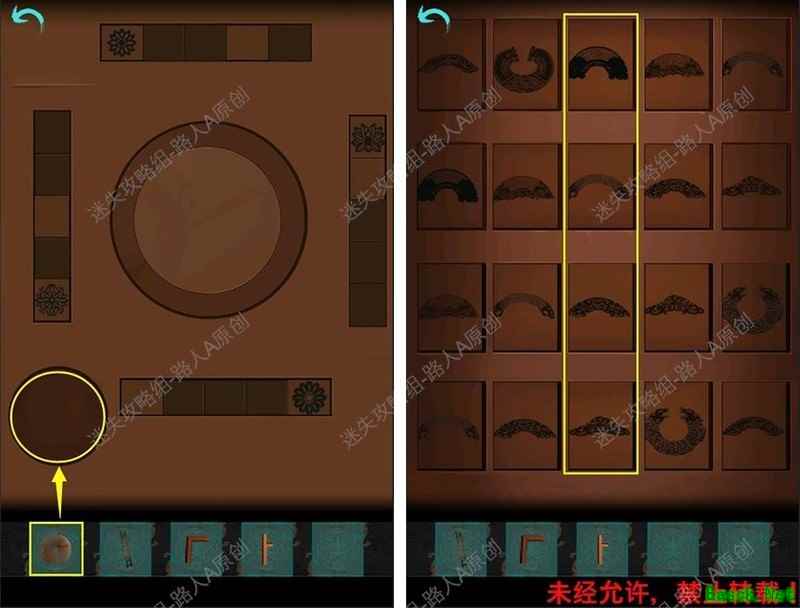 将玉盘置入桌面凹槽,参照灯柱图案调整机关,获取灯罩。注意第三个图案有两个相似选项,易出错,请仔细辨别。