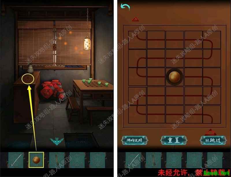 掀开地毯,用红绳引导迷宫小球完成游戏,获取木块一。