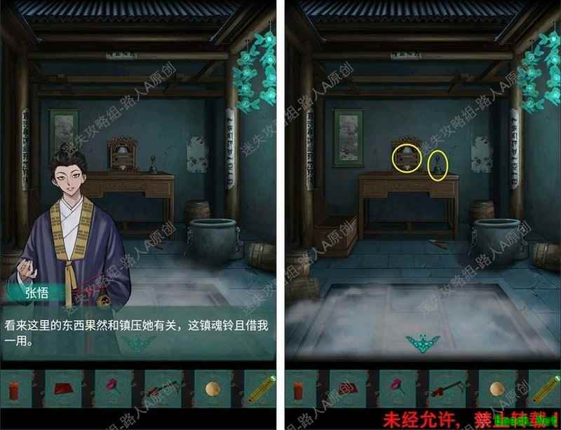 点击神龛会触发女鬼出现,随即点击镇魂铃即可将其驱散。