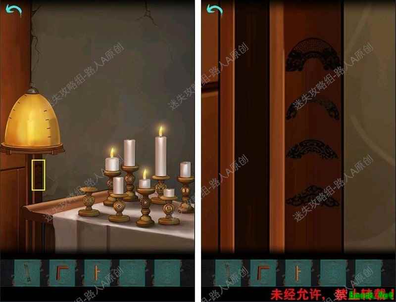点燃蜡烛,将其置入灯罩获取刻度,对照烛台图案调节桌面机关,最终获得第二块木块。