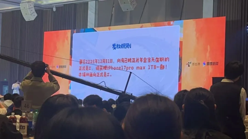全员阳光普照:2025 年 12 月 31 日前转正且在职员工,每人iPhone 17 Pro Max 1TB,现场形成 “iPhone 墙”。