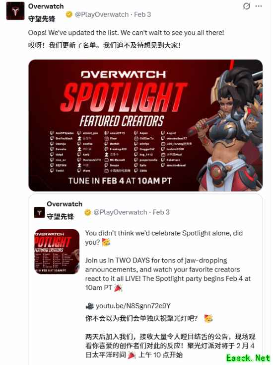 《守望先锋》官方最初发布的邀请名单中,包含Aspen Frogger、KarQ等主播,随后又发布更正推文并配文“哎呀,我们更新了名单,等不及和大家见面了”,这一简单的行政失误纠错行为,迅速点燃社群讨论热情。在《守望先锋》社群中,名字承载着极高的分量,名单的增减不仅关乎创作者的参与资格,更被视为官方对不同群体的态度体现,因此此次疏漏引发的争议远超普通失误。