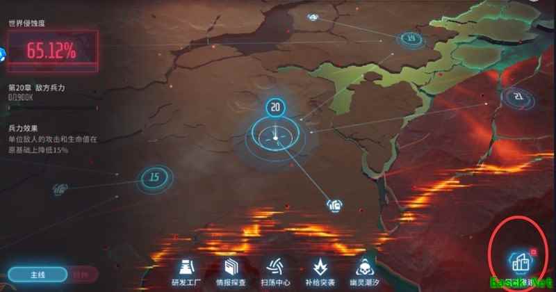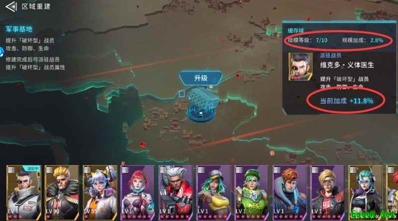建筑物升级后可提升战力百分比,具体区域重建示例所示。后续将以当前主流的破坏型军事基地为例进行说明,其他类型建筑的操作与加成方式与军事基地相同,各位监察官可参考使用。