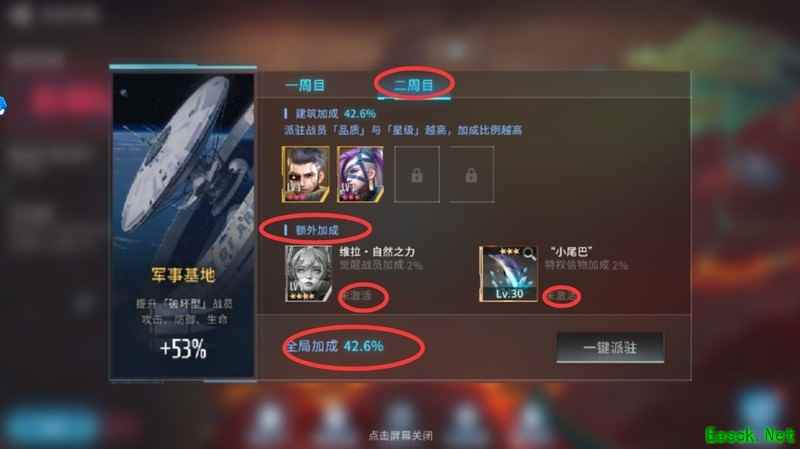 主线任务现已全部完成,破坏型军事基地建设分为一周目和二周目两种模式。玩家可一键派遣监察官进行派驻,一周目与二周目各配置两名破坏型派驻人员,总共四位,建议优先选择高星级战员。每位派驻人员均可对建筑进行升级。此外,不同类型建筑还拥有专属额外加成,例如一周目破坏型建筑可获得龙战员及义隼信物加成,二周目则提供维拉与小尾巴信物加成,其他加成效果玩家可自行查阅。