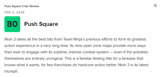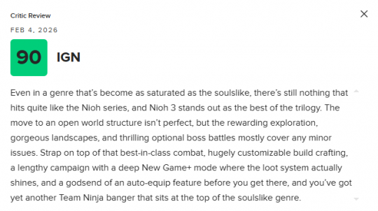 《仁王3》将于2月6日正式发售。近日,本作的媒体评分也已解禁。截至目前,《仁王3》M站媒体均分为86分,共收录72家媒体。其中,IGN给出了9分的好评。