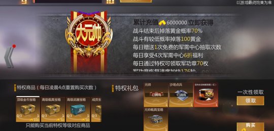 本次春节版本新增特权等级“大元帅”,达到特权等级的玩家可获得大元帅称号及头衔,同时也可购买大元帅专属特权礼包。