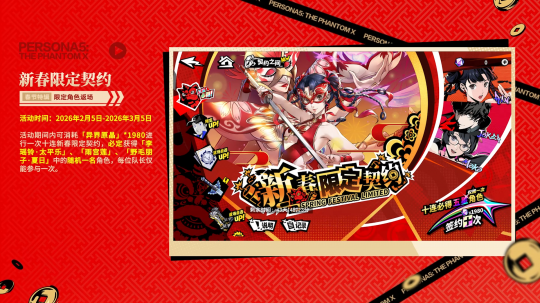 活动期间内可消耗「异界原晶」*1980进行一次十连新春限定契约,必定获得「李瑶铃·太平乐」、「雨宫莲」、「野毛朋子·夏日」中的随机一名角色,每位队长仅能参与一次。