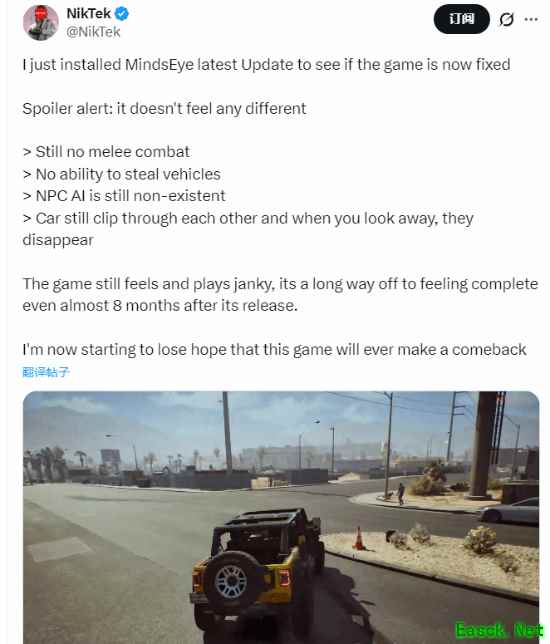 根据SteamDB数据显示,更新上线后,《心之眼》的同时在线峰值仅增加了12人。平均在线人数同样不容乐观,更新后平均24人在线。国外游戏博主@NikTek发文锐评了本次更新,他表示更新后感觉没有任何变化 ,游戏仍然没有近战、无法偷车、NPC依然形同虚设、汽车穿模问题仍然存在。