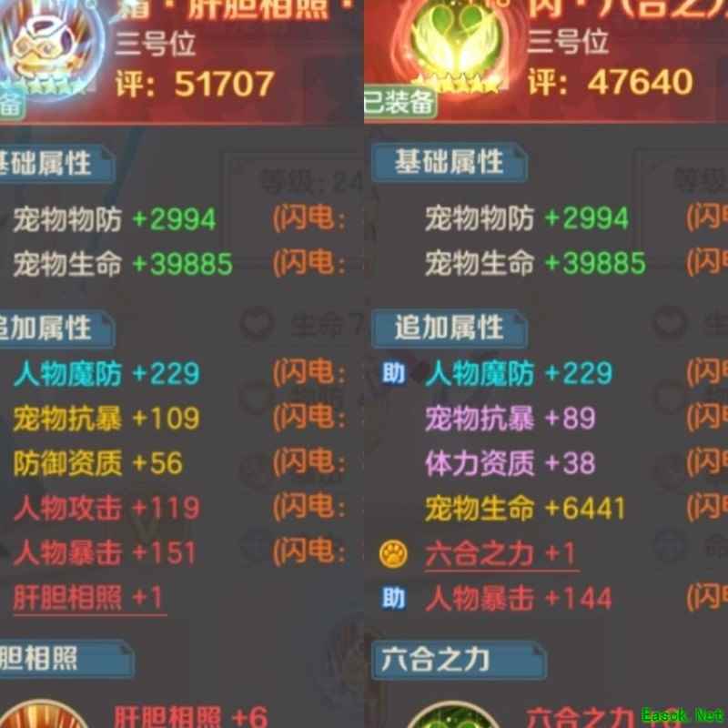 宠物装备可选三套肝胆或两套肝胆加一套护主,一号位洗练命中属性,三号位优先堆满人物暴击,辅助位置三号以人物暴击为最高优先级,即使无技能等级也可接受。