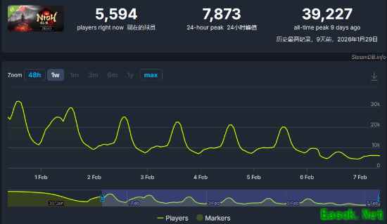 据SteamDB,该作体验版下载超100万次,高人气带动正式版销量,7万在线仅次于《卧龙:苍天陨落》的7.6 万峰值,周末能否破纪录备受关注。