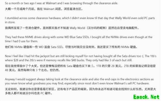 该用户还确认所有硬盘状态良好,并透露同批清仓货架上另有WD Blue SATA SSD,1TB版28美元、2TB版48美元,当时由于犹豫未能一并收入囊中。