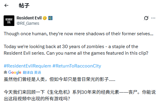 “他们曾经是人类,如今却只剩下过去的影子……今天,我们回顾《生化危机》系列中30年的丧尸历史——这一不可或缺的组成部分。你能认出视频中出现的所有作品吗?”官方在视频中如此写道。