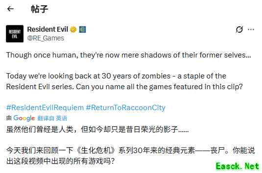 “他们曾经是人类,如今却只剩下过去的影子……今天,我们回顾《生化危机》系列中30年的丧尸历史——这一不可或缺的组成部分。你能认出视频中出现的所有作品吗?”官方在视频中如此写道。
