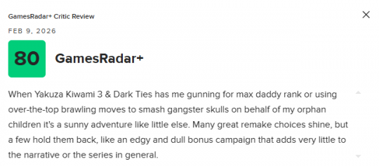 《如龙极3/如龙3外传 Dark Ties》将于2月6日正式发售。近日,本作的媒体评分也已解禁。截至目前,《如龙极3/如龙3外传 Dark Ties》M站媒体均分为75分,共收录40家媒体。其中,IGN给出了7分的评价。