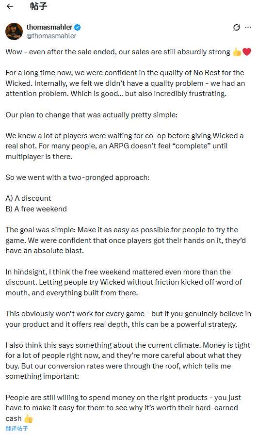 “哇——即便促销结束后,我们的销量依然强得离谱,”他在推特上写道。他解释称,自己早就意识到许多ARPG玩家一直在等待合作模式,因此才决定通过折扣和免费试玩周尽可能放大这次更新的影响力。“目标很简单:尽可能降低玩家尝试游戏的门槛。我们有信心,一旦玩家真正上手,就一定会玩得非常开心。”