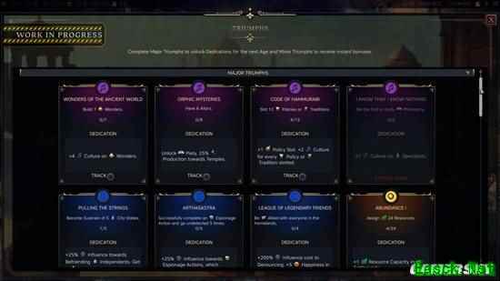 与传承路径不同,伟业系统不会限定玩家的战略思路,而是提供大量可选的高难度目标,让每一局游戏都独具特色。伟业关联军事、文化、科技、经济、外交、扩张六大属性:部分伟业可通过常规强势玩法达成,比如人口达到 200、首个建成大学;另一些则需要特殊玩法,比如与所有文明同时交战、抢占大部分自然奇观。完成伟业可获得帝国即时加成,或在下一时代开局时使用的战略卡牌。