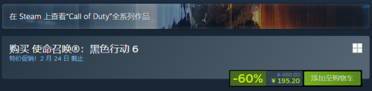 近日《使命召唤:黑色行动6》迎来新史低促销,标准版原价488元,现仅售195.2元。截至发稿前,该作在Steam上总评为“褒贬不一”,好评率为42%。