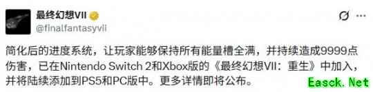 此外,官方还将未来陆续为PC版以及PS5版更新官方作弊器,让玩家能够保持所有能量槽全满,并能一直造成9999点伤害。该功能已在Switch2版和Xbox版的《最终幻想7:重生》中加入。