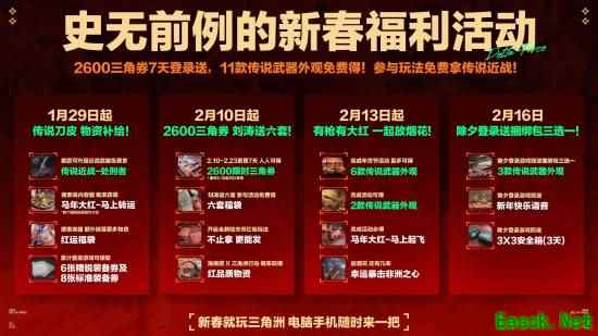 新春来洲接“红”礼!2月13日起,参与春节活动,可免费解锁8款传说武器外观。2月16日起登录游戏,更可额外领取3款传说武器外观,最多可拿11款传说武器外观!