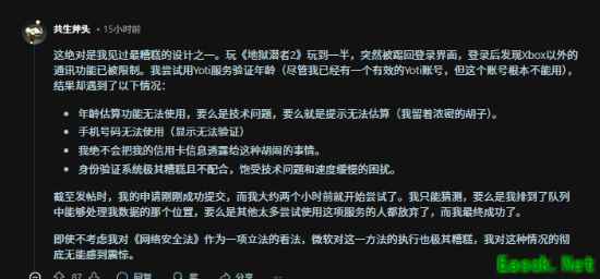 有玩家吐槽称“这是我见过做得最烂的更新之一。在玩《绝地潜兵2》时被直接踢回登录界面,登录后才被告知Xbox以外的通信现在受限。”玩家表示尝试了多种方式验证年龄,包括提供手机号、身份证等,但仍然报错。
