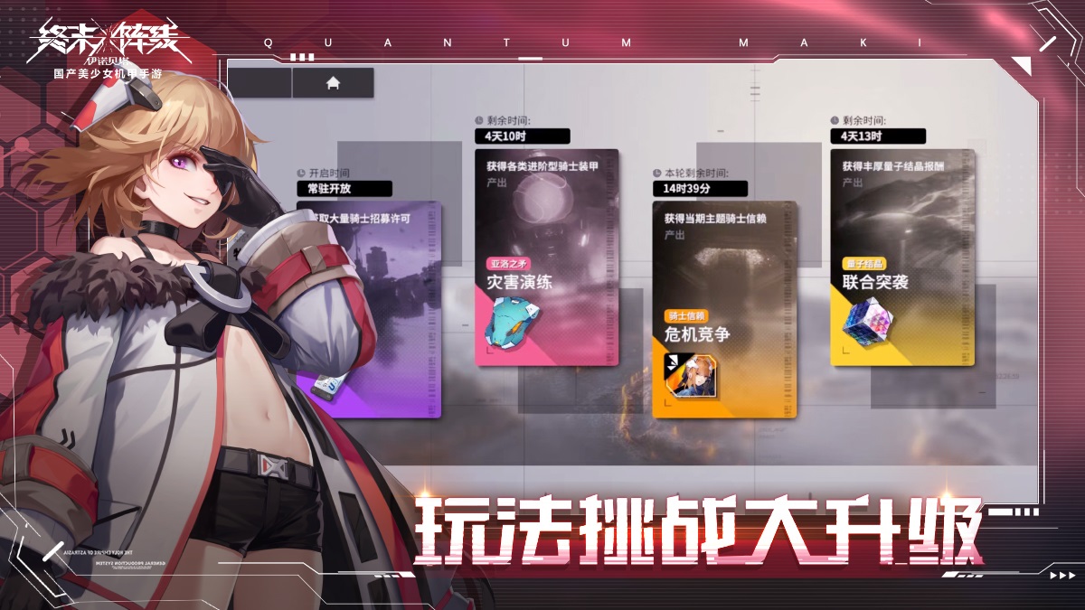 挑战玩法大升级,挑战阵容极限,永攀高峰夺取荣耀,赢取丰厚奖励!《终末阵线》的挑战玩法是对每位指挥官的极致考验:每位指挥官需要根据不同特性的敌人阵容,组建最佳挑战阵容以展现指挥官实力,赢取丰厚的奖励!在即将到来的全新版本中,挑战玩法迎来大升级,进一步考验指挥官对于阵容搭配的理解。丰厚奖励也将全面升级!