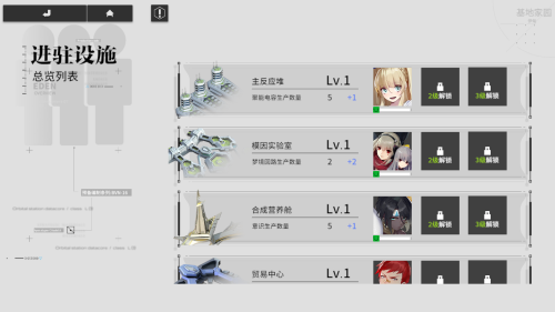 伊甸基地中可建造六个设施:控制中枢,统筹基地设施的建造与改建。升级控制中枢后,基地内各设施才能升级为相应等级。