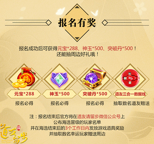 本次玩家代言人征集将一共经历三个阶段,7月5日至7月11日为海选报名阶段,报名即可获得奖励。7月12日至7月15日为官方筛选阶段,海选晋级名单将通过《道友请留步》微信公众号进行公布。7月16日至7月21日则为全民票选阶段,票数最高的三位玩家将成为代言人