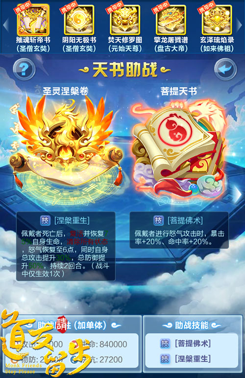 除此之外,道友们还可以使用金色天书和红色天书为“催魂斩帝书”进行助战。这可是高品质天书特有的系统。天书助战不仅可以提供额外的基本属性加成,还可以获取特殊技能。紫金天书将拥有比金色天书更多的助战位置,因此,综合实力将比其他品级的天书高出不止一点!