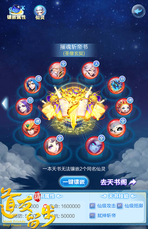天书是《道友请留步》中的特殊系统,当玩家等级达到指定等级后将会自动开启。上阵神仙可以通过佩戴天书获得属性加成,同时每一本天书都有各自不同的属性和强力技能。催魂斩帝书作为紫金品质的天书拥有凌驾于其他天书之上的仙级攻击和抵御加成,同时还有专属的“弑神斩帝”技能,该技能当己方有2名及以上神仙阵亡上必定触发,可谓是逆风翻盘的神技!