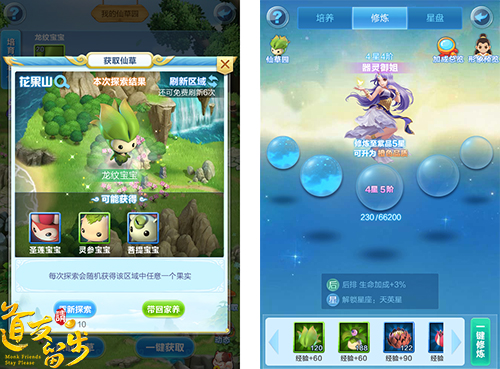 春天除了是旅游的季节也是种草的季节,《道友请留步》仙草园里的小可爱们也在嗷嗷待哺了。探索花果山、搜寻金色品质仙草,放入仙草园中培养,最终可用于器灵修炼。修炼后的器灵将化身成颜值超高的御姐,并解锁强力属性加成呢!