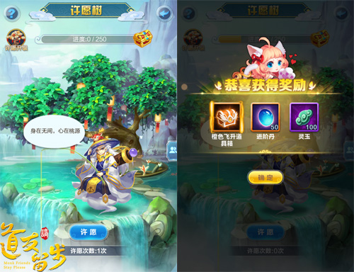 除了基础建筑之外,还有一处桃源福地不容错过,那就是仙府山脚下的许愿树。诸位道友每日都可以前往许愿树进行许愿,并且将随机获得大量奖励。除了为自己许愿,玩家还可以前往好友的许愿树下为好友献上祝福,祝福达到一定数量还将获得一份超稀有的珍贵奖励。