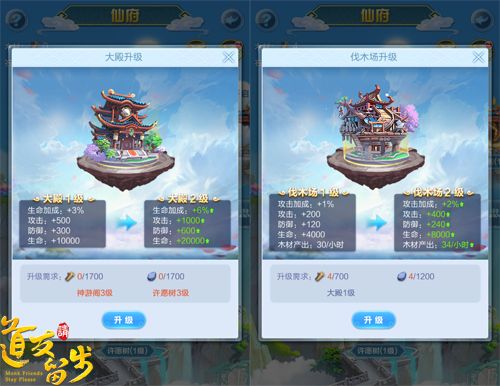 在初始的仙府中,包含大殿、采石场、伐木场等基础建筑。这些基础建筑不仅可以生成升级仙府所必须的材料,还可以为上阵卡牌提供全阵容永久属性加成。同时,随着仙府等级的提高,加成的比例也将水涨船高。