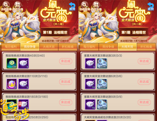 同时,活动期间完成指定的主题任务还将百分百获得节日兑换道具“元宵”以及附赠的主题活动奖励。本次元宵节期间的主题活动共分为两期,第一期为竞技争锋和大闹天宫,参与竞技场挑战和大闹天宫玩法达到一定次数即可获得主题活动奖励。