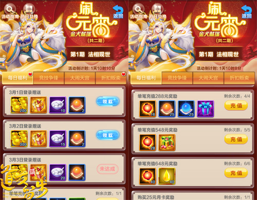 元宵节期间(3月1日至3月6日),玩家登录《道友请留步》即可领取大量金元宝和元宵大礼包,元宵大礼包中可以随机开出特级锻造石、紫色灵武精华等多种稀有升级材料。除了登录好礼之外,单笔充值达到一定金额还将额外获得丰厚的单充大礼包,金色法相精华、红色法宝碎片免费附赠。