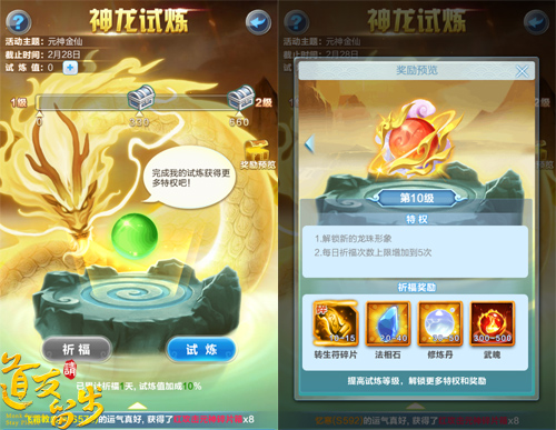 小编在接触了神龙试炼玩法后,深深体会到“《道友请留步》是0氪党的福音”这句话绝对不是吹的。神龙试炼玩法包括神龙祈福和试炼任务两个部分。道友们通过向神龙祈福即可获得随机奖励,累计祈福的天数越多获得的奖励也将越丰厚。完成日常玩法即可同步获得试炼任务的奖励。神龙试炼的玩法特点在于,玩家完全不用投入额外的游戏时间就可以轻轻松松获得更多的培养材料。