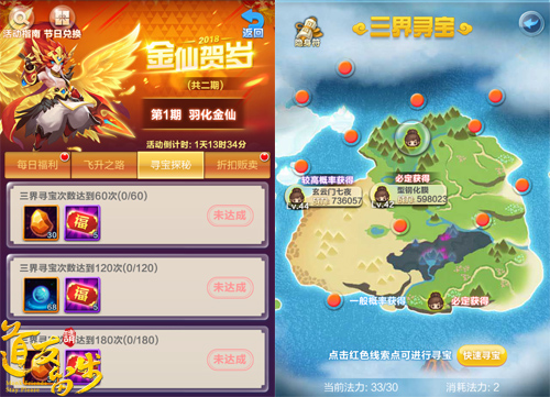 在《道友请留步》中,当玩家达到17级时将开启三界寻宝玩法,三界寻宝是获得法宝的主要途径之一。在寻找法宝的过程中,还有机会获得极为丰厚的元宝奖励,一旦错过就仿佛亏了一个亿。本次金仙贺岁的活动中,玩家完成飞升之路不仅可以获得三界寻宝本身提供的各种奖励,还可以获得紫色灵武精华、灵玉以及福卡。