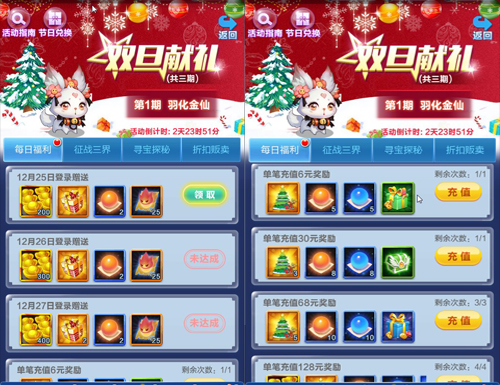 寻宝探秘和征战副本是道友们修仙证道的岁月中,每天都要进行的事情。在双旦活动中,道友只要寻宝探秘和征战副本达到一定的次数,道友们就可以获得大量的养成材料等。还能获得双旦限时活动道具-元旦灯笼用以兑换红仙升金仙必备的升金丹,金卡近在咫尺,美滋滋哇。