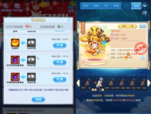 本次周年庆活动除了“颜值爆表”以外,另一个特点就是“实力超群”。本次周年庆期间,《道友请留步》将开放神仙化圣系统。当神仙等级达到85级,品质为红色或橙色时,就可以获得化圣资格了。通过完成化圣任务,神仙将逐步提升境界,实现战力的再突破。羽化金仙,傲视群雄。而化圣任务必不可少的就是大量的化金丹了。双旦活动期间,灯笼换化金丹,助力道友迅速羽化金仙,开启三界制霸之路。