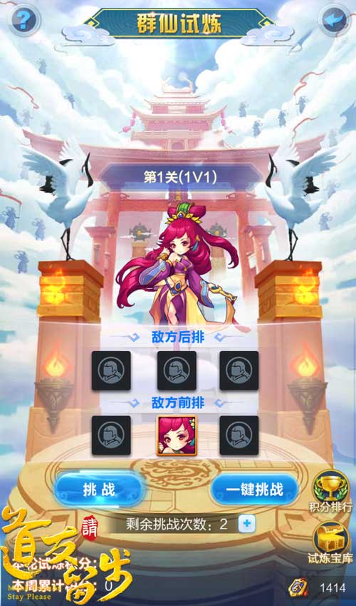 群仙试炼的挑战时间为每周一早8点至每周日的晚24点,每天0点将重置试炼关卡。试炼关卡一共包括6关,从1V1直到6V6,玩家可以任意的选择神仙进行挑战。由于可选神仙的多样性和上阵神仙的多种组合搭配,使得“群仙试炼”玩法脱离了战力无脑碾压的桎梏,更增添了趣味性和策略性。