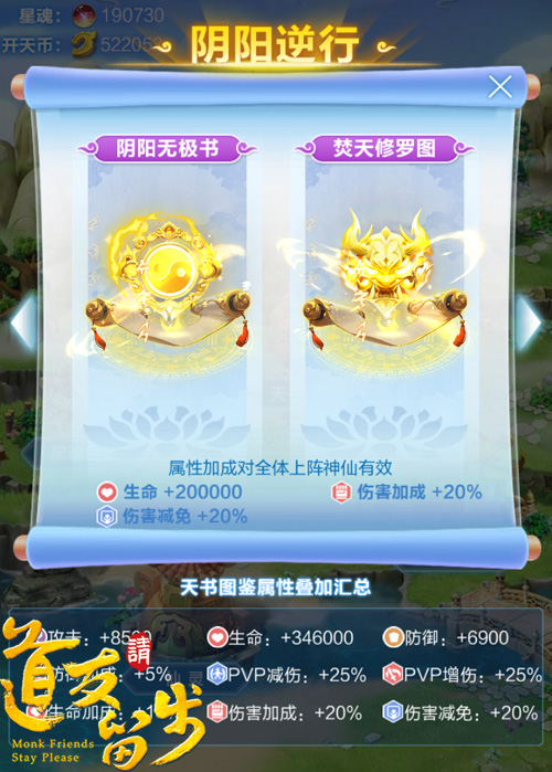 天书的属性加成能力不仅体现在对于单一上阵神仙的辅助上,还体现在全体阵容的属性加成上。而本次推出的金色天书图鉴“阴阳逆行”将提供超乎想象的强力支援,血厚防高,能抗能打。无论是PVE还是PVP都具备无与伦比的实用性。更多关于金色天书的最新消息敬请关注《道友请留步》微信公众号。