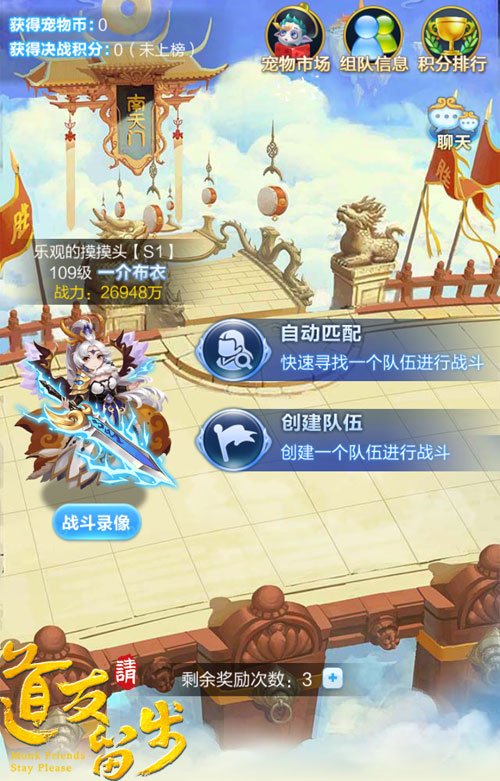决战南天门是跨服3人组队战斗玩法,是获得宠物培养进阶资源的主要途径。想要养成一只心仪的萌宠,不妨来南天门试试身手吧!在决战南天门玩法中获得一定的积分,还有机会获得专属称谓,“天庭之主”、“斗战胜佛”这些霸气的称谓不仅为你带来超高的回头率,更有强力的属性加成效果。真可谓是一箭双雕、事半功倍呀!