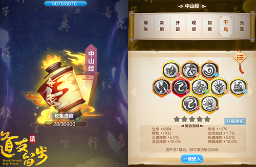 本次版本更新的核心内容之一即是开放了金色品质的山海经经书“中山经”。当玩家在《道友请留步》中的等级达到55级即可开启“山海经”系统。收集神秘志怪,解锁山海经书,“山海经”在玩家的战斗中并没有直接的技能展示,但是经书可以为玩家带来全面的属性提升,在无形之中增强战力,让敌人防不胜防。